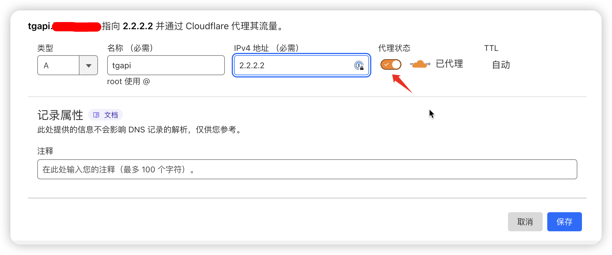 添加好路由后,新建一个DNS记录。随便用一个ipv4的地址指向这个前缀。把代理状态打开,点亮小橙云。